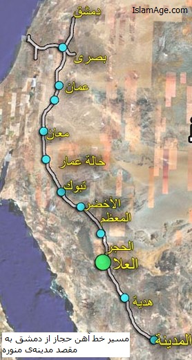 تصویر مقابل مسیر قطار را تا مدینه‌ی منوره نمایش می‌دهد. این خط ریلی پس از افتتاح رسمی آن در سال 1326هـ (1908م)، تا نه سال به حجاج و اهل حرمین خدمات شایان و ارزنده‌ای تقدیم کرد، اما این خط در جنگ جهانی اول مورد حمله‌ی دشمنان اسلام قرار گرفت و آن را بمباران کردند.
